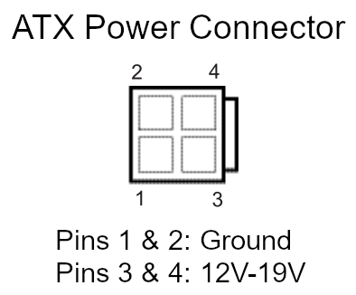 The motherboard DC power cable can be ordered with a 4-pin ATX power plug that fits most single voltage motherboards like the ones we recommend.