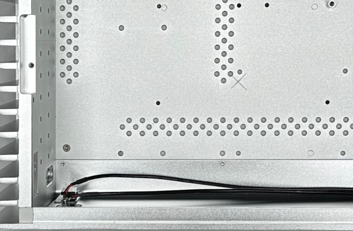 Before installing the motherboard’s DC power cable twist the wires evenly down the length. Plug the motherboard cable into the power supply and lay the twisted pair of wires along the front of the chassis behind the face plate and down the right side of the chassis. If you are using a CPU that is heat sunk to the right side of the chassis you may need to navigate the wires around the FC10’s heat pipes.