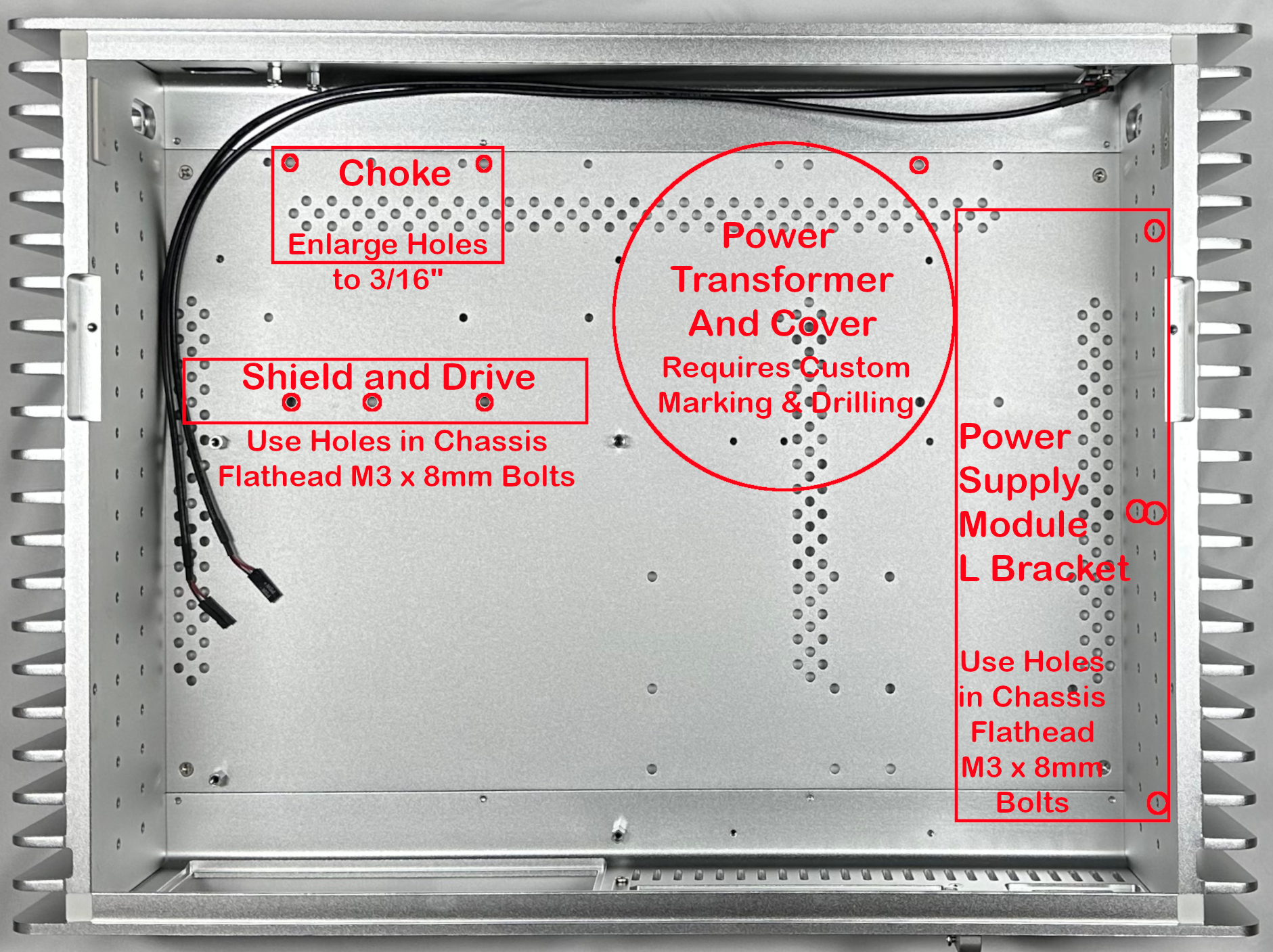 The power supply module mounts to the heat sink on the left side of the chassis using existing holes and four of the M3 x 8mm flathead bolts that come with the chassis.
