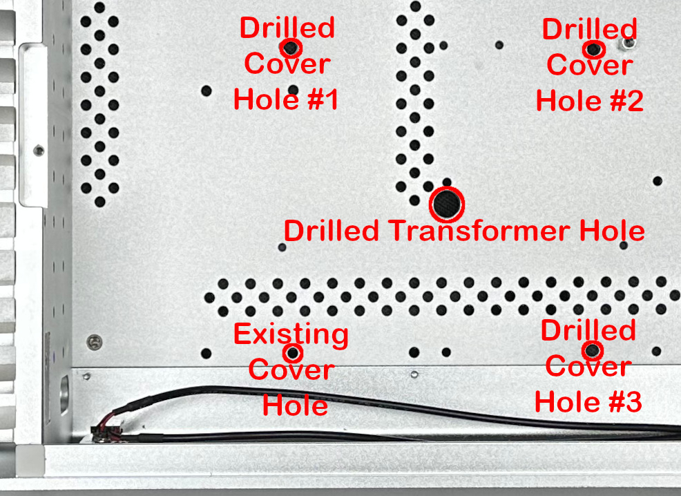 - Use the 3/16” drill bit for the transformer cover’s corner holes.